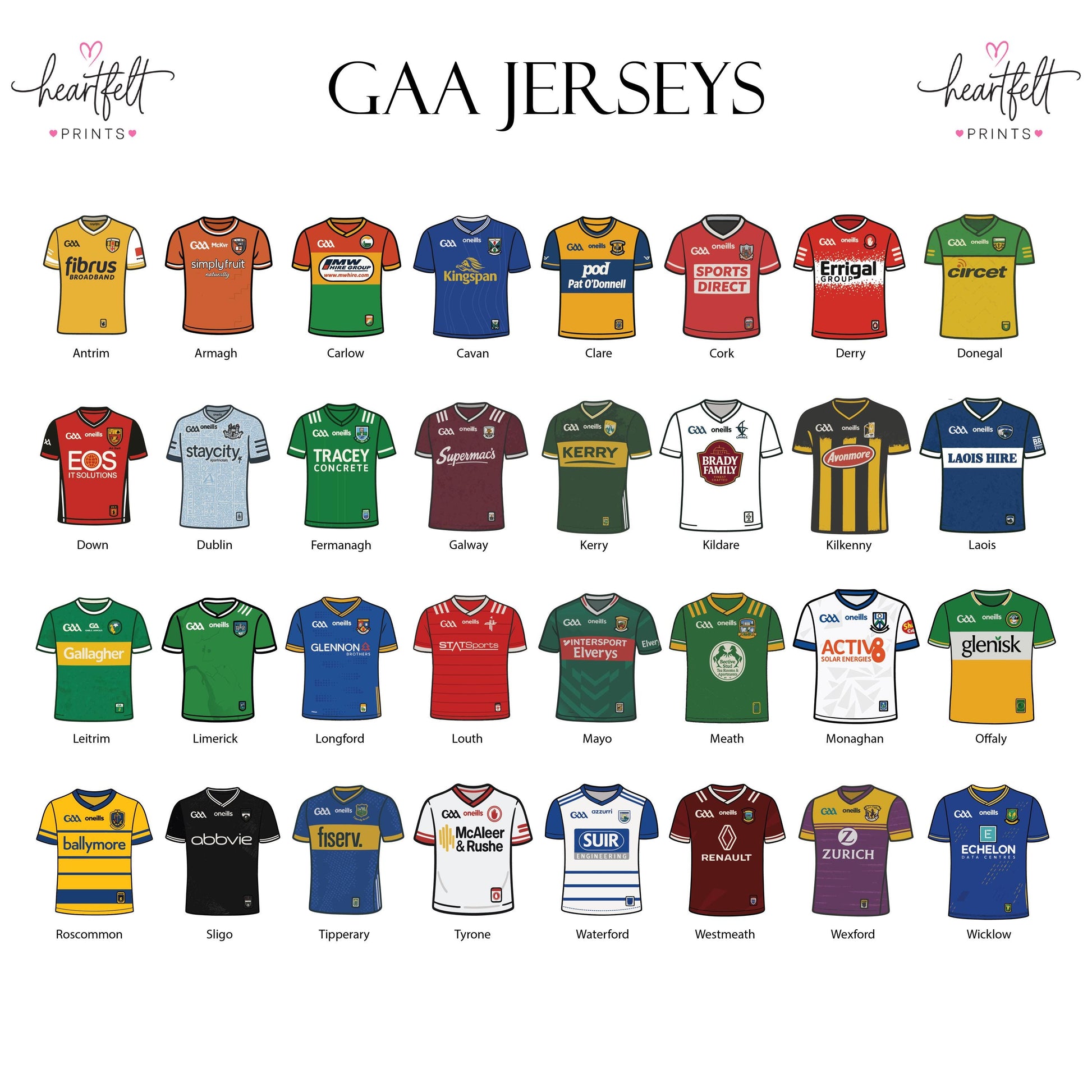 Antrim, Armagh, Carlow, Cavan, Clare, Cork, Derry, Donegal, Down, Dublin, Fermanagh, Galway, Kerry, Kildare, Kilkenny, Laois, Leitrim, Limerick, Longford, Louth, Mayo, Meath, Monaghan, Offaly, Roscommon, Sligo, Tipperary, Tyrone, Waterford, Westmeath, Wexford, Wicklow