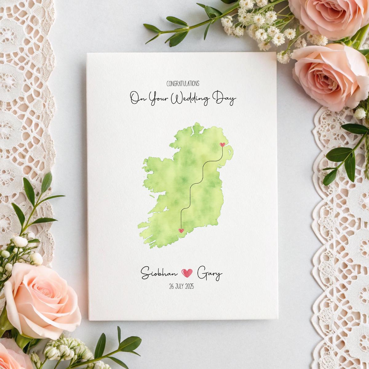 Celebrate Irish love stories with a personal touch! This charming wedding card features a soft green watercolour map of Ireland with two heart markers connected by a dotted line – symbolising the unique journey of the happy couple.
