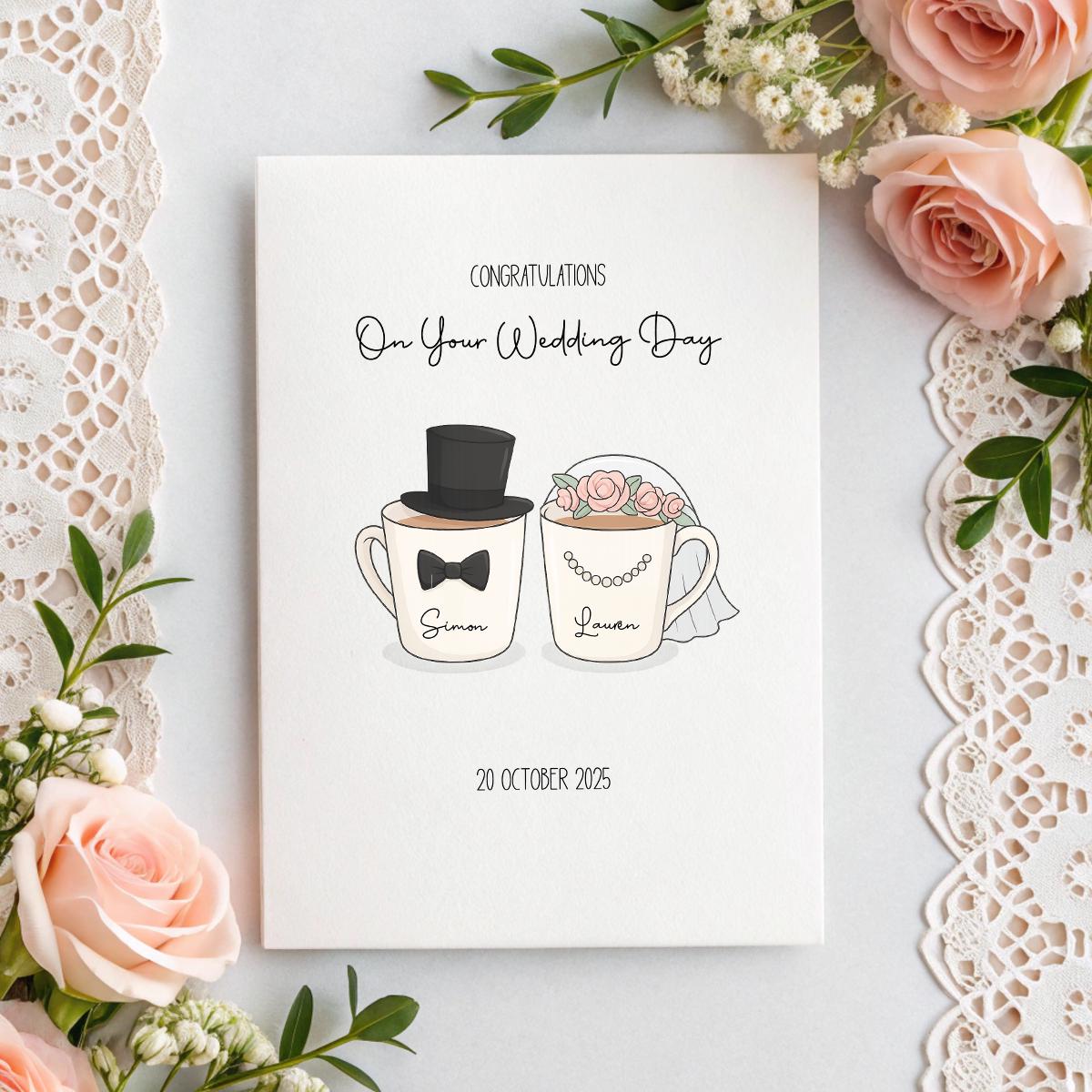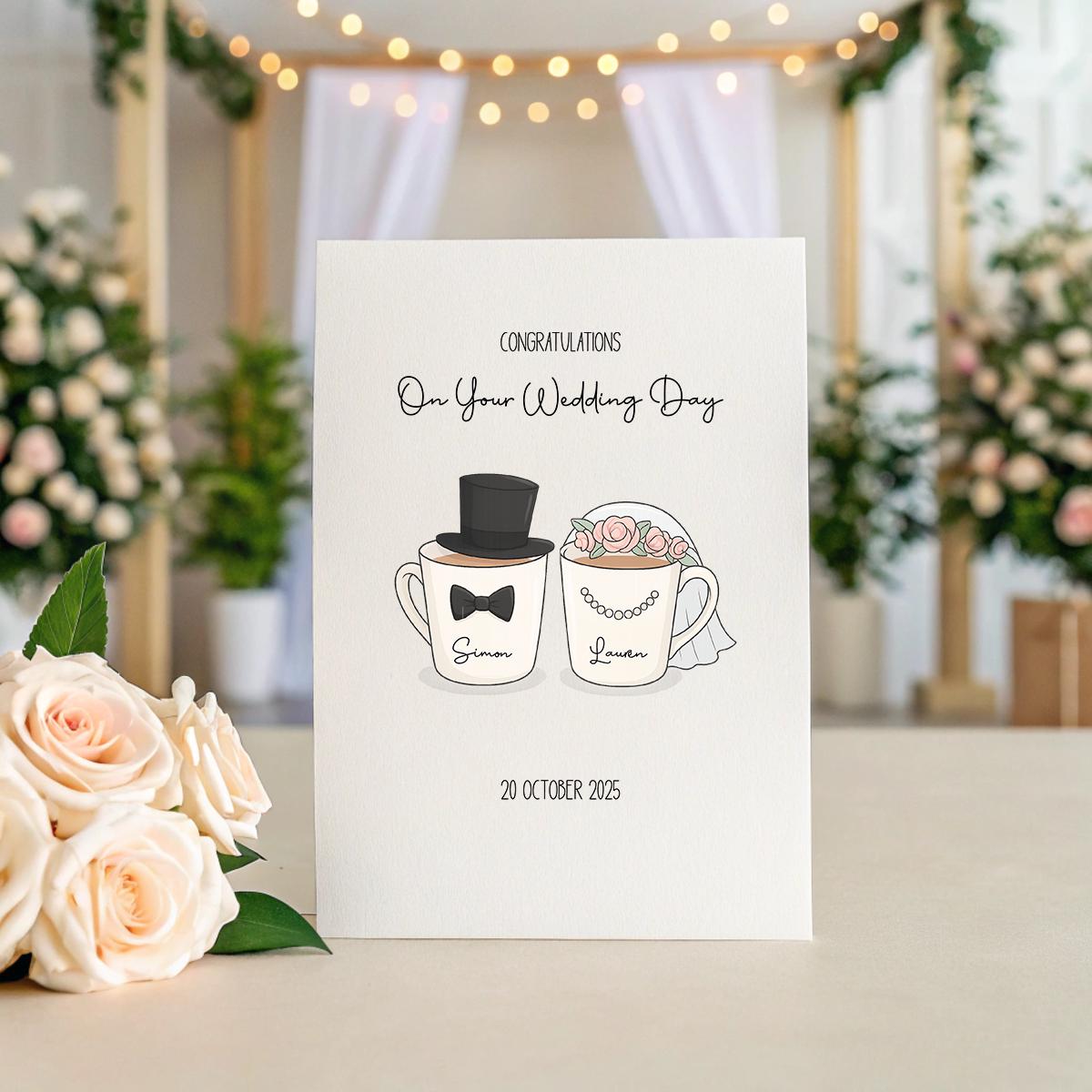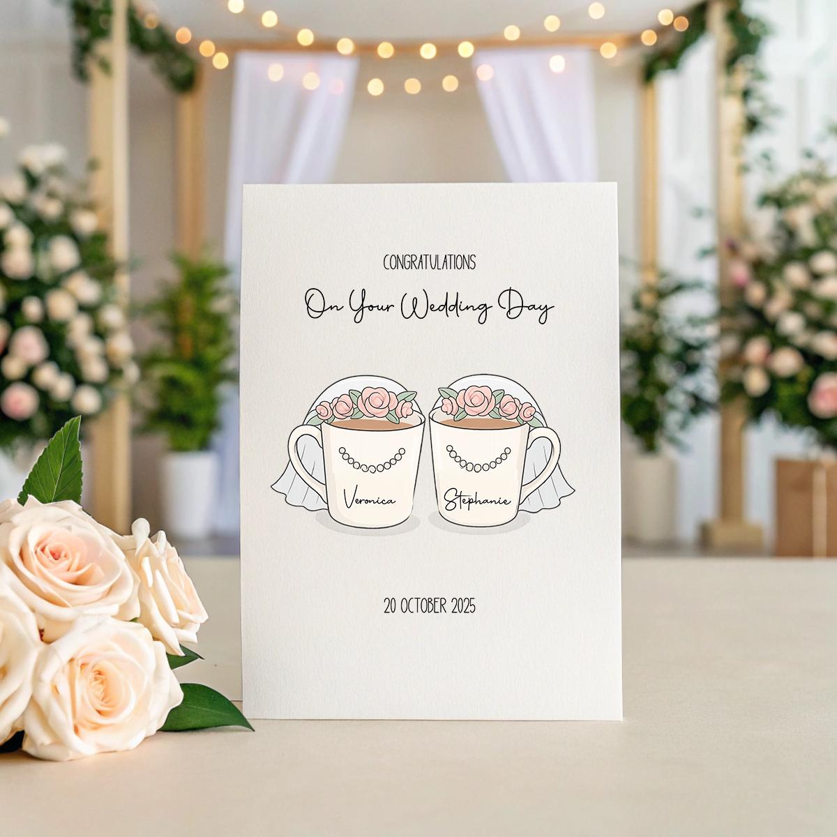 This adorable Personalised Wedding Day Card features two illustrated mugs styled as the happy couple — whether that's a bride & groom, two brides, or two grooms — making it a perfect fit for every kind of wedding celebration 💕
