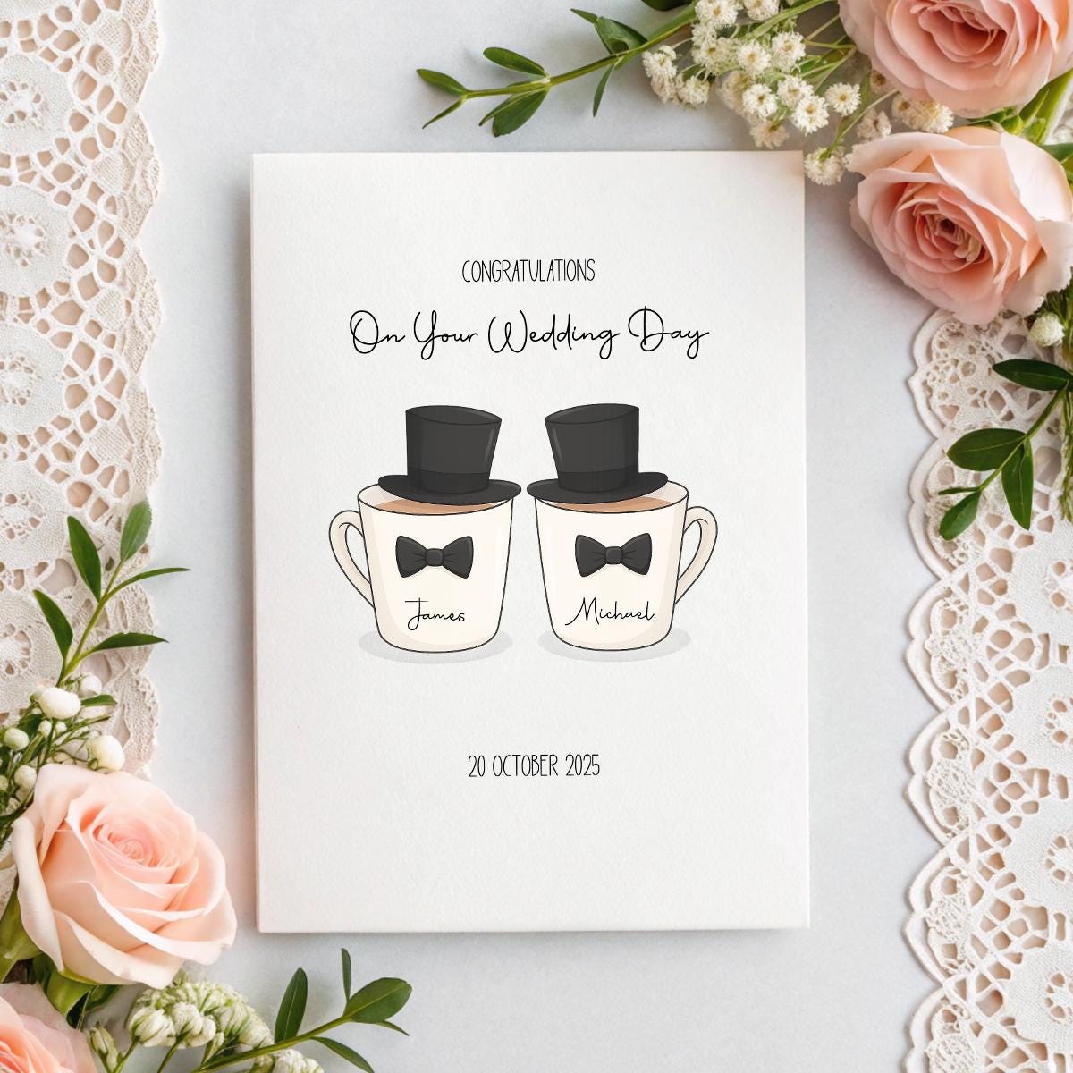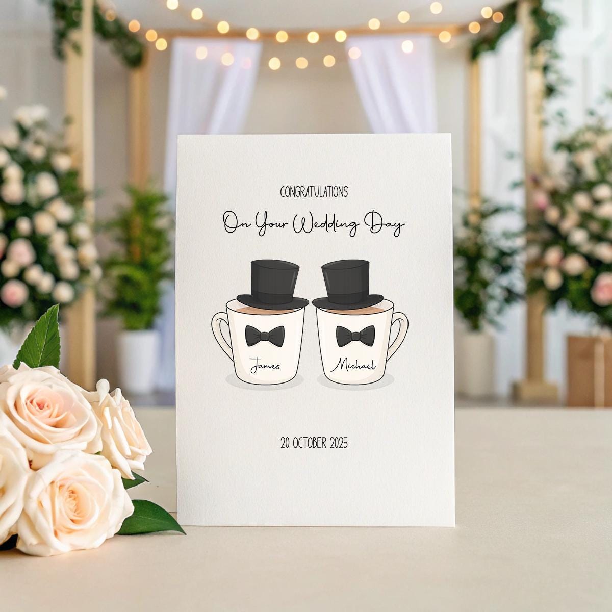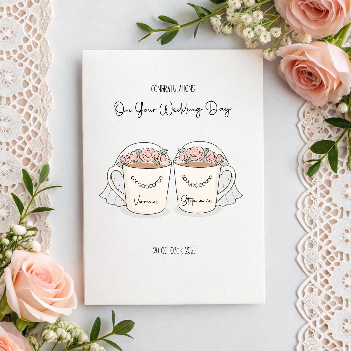 This adorable Personalised Wedding Day Card features two illustrated mugs styled as the happy couple — whether that's a bride & groom, two brides, or two grooms — making it a perfect fit for every kind of wedding celebration 💕